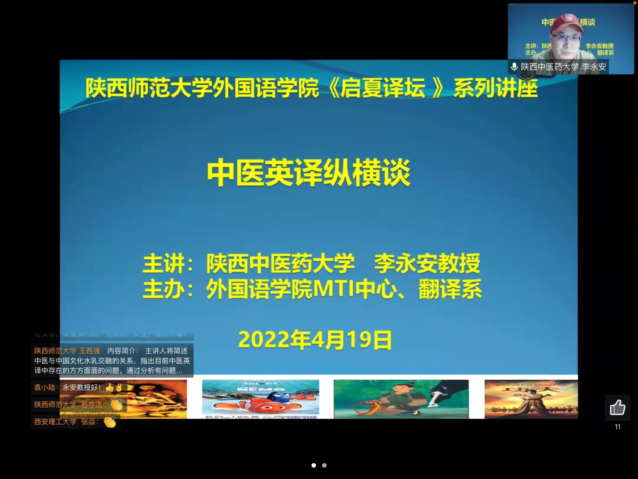 2022年4月19日,best365正规“启夏译坛”第4讲暨“翻译实务系列讲座”第4季第5讲《中医英译纵横谈》云端开讲。讲座由陕西中医药大学best365经理、国际教育公司经理李永安教授主讲,公司尚亚宁教授与谈,王西强教授主持报告并总结,全国多所高校的专家、学者和员工及公司师生线上参加讲座并积极互动。