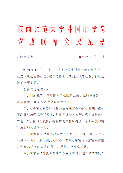 公司党政联席会议纪要(2019年11月12日)